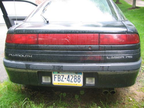 Up for sale is my 1st generation DSM Plymouth Laser. Most of you looking at this know it's identical to the Mitsubishi Eclipse and Eagle Talon. This vehicle had only two-owners...my father in law bought it new and sold it to me a few years ago. Since I've had it, I have done a lot of work to keep it in great mechanical condition and have included pictures of a lot of things. But if you have any questions, ask me. I have receipts for everything since the car was new...even gas! The vehicle is front-wheel drive and automatic transmission. It has power door locks, windows, and even keyless remote entry with a remote start that I had installed. The engine runs great, good power and great compression. The transmission shifts smoothly through all gears and overdrive works too. The paint is dull in a lot of places from the clear peeling off which is common for these years. And there is a little surface rust in some areas that you can see in the pictures. Car has brand new tires with less than 500 miles on them. I had the wheels sand-blasted and powder coated black for a factory finish. Then I searched the whole country for original hubcaps and installed those. The front and rear brake pads and rotors have all been recently replaced as well (within 2K miles). Under the hood I replaced the battery with a Bocsh, replaced the fuel and air filters, and replaced all the belts. I also removed the valve covers and replaced the gaskets because they started to leak. I replaced the spark plugs at the same time. Two of the motor mounts were replaced due to age (drying/cracking). The front suspension had an overhaul too. I replaced the front control arms, and all new bushings, ball joints, and sway-bar links were installed. Inside the car I reupholstered the headliner and rear shelf with factory material because they started to fade with the sun. I also replaced the radiator and flushed the coolant system. Pretty much the whole car is new. The only thing I didn't do is fix the A/C. I have the parts purchased already to fix it, but they are not installed. yet. I am an ASE Certified Technician for over 8 years and have been a Master Certified technician for Mercedes-Benz my entire career, so you know all the work is done right. Please ask any questions. Thanks.