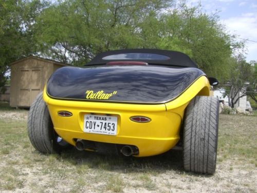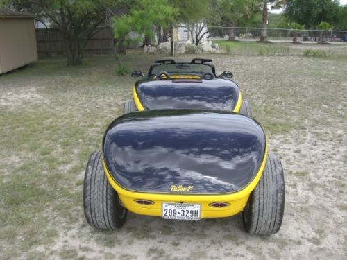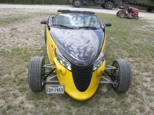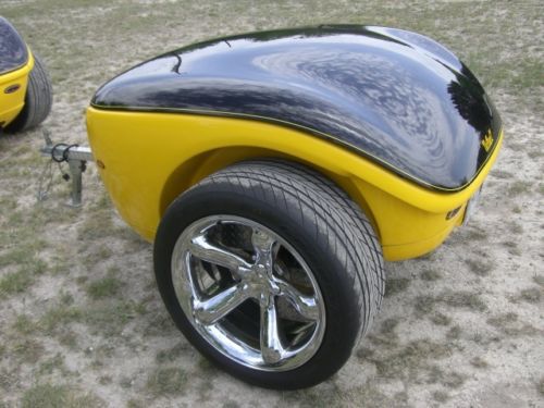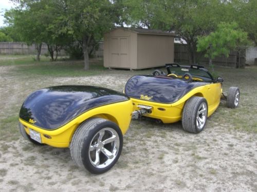 '99 Prowler, Black top and Yellow bottom and painted single-line pinstripes similar to a Black Tie or Woodward. The car has appx 107800 miles and still runs fine. Normal Oil Pressure, Cooling and Shifting. It has a few oil drips, not much, from a leaking Valve Cover Gasket. It doesn't bother me as I just throw a piece of cardboard under it to catch the drips. The interior shows some wear and the exterior paint has some chips and paint flaws in a few places but this car is really fun to drive. Best of all, this Highboy Prowler is 1 of only 20 made. The Highboy Trailer is a One-Of-A-Kind. Highboy Kits are pretty rare, I have never seen another except in pictures. Everything works, the Wheels are nice and I'd rate them a 8 1/2 out of 10. The Tires on the car are Runflats with about 85% wear left on the Rears and 95% wear remaining on the Fronts. The car and Trailer have both always been garaged. The Convertible Top has been replaced at some time and has no cuts, wear spots or tears on the outside. It has Prowler-Pro Belanger Headers with no cats but I do have the "Y" Pipe with cats by Prowler Pro that goes with the car when sold (see last pic). It has a Custom Radiator that always runs cool, a Custom Trailer Hitch that is hidden behind the rear fold-up Licence Plate and a TGF Front Turn Signal Replacement Kit (no longer made and very collectible). It has a Prowler Yellow Custom Prowler Steering Wheel, a 300M Shift Knob and some other Interior upgrades. I have done a lot to this car to make EVERYTHING work as it should and in the process, replaced a lot of worn parts. It also has a New Battery, a Door Wider-Opening Kit installed, and Stainless Sill Moldings. I'm sure I have forgotten some of the options added to this unique Prowler. Although it nearly has 108,000 miles on it, that actually works out to less than 7200 miles per year. There still is a LOT of life left in this one. In my thinking this car would be Perfect as a 2nd Prowler for a Prowler Enthusiast who already owns a Stock Prowler and knows his or her way around one. It has NEVER been in any accidents. The Outside Mirrors are finicky, sometimes they move left and right, top and bottom and some times they dont. Doesn't bother me, as once they are in position for me, they stay that way. It also comes with the One-Of-A-Kind Prowler Highboy Ajax Trailer, the one in the pics. The ONLY Highboy Trailer ever made, with 20" Prowler Wheels and Tires and with the same paint scheme as the car. The Car is nick-named "Outlaw" since the headlights are painted black and makes the car look like a bandit. The Trailer is "Outlaw II" but both are decals and can easily be removed. Comes with both Keys and Remotes, a complete Owners Manual and the Prowler CD that you were supposed to get when the car was originally bought. I also will include both Stock Rear Quarter Panels, both Tail Lights and the Rear Body Panel that can be used to convert the Car back to Stock, should the new owner want to (see next-to-last-pic). This is nearly $2500.00 alone, in extra parts! Just keep in mind that this car is very Fun, Fast and Reliable and if you think you attracted a lot of attention in your Stock Prowler, be ready to REALLY attract attention in this one. The annual Texas car safety inspection was done recently and it passed with NO problems. Both Car and Trailer have lien-free Texas Titles and up to date Registrations and License Plates. Selling the car and trailer as a package, for the one bid price. Please keep in mind that this car is NOT a Garage Queen but a fun driver. I would suggest any potential Buyer come and look it over or have your representative look at it for you before you bid. If you are married, be sure your Wife is OK with it before you bid.. I have a few extras I may throw in on the deal too.