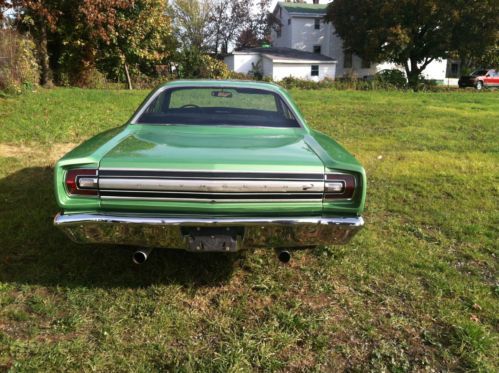1968 383 4 SPEED ROAD RUNNER F6 GREEN MECHANICALLY IT IS BRAND NEW TO THE WHEEL STUDS INCLUDING ENGINE, TRANSMISSION, 3RD MEMBER,ALL SUSPENSION TORSION BARS, LEAF SPRINGS,DISC BRAKES.RUNS AND DRIVES PERFECT.SHIFTS SMOOTH, E BRAKE WORKS ALL LIGHTS, WIPERS, HEAT ,FUNCTION AS THEY SHOULD.I DID THE BODY PERSONALLY AND HAVE A LOT OF TIME BLOCKING THIS CAR TO BE STRAIGHT.IT LOOKS AWESOME AND IS RUST FREE.UNDER CARRIAGE IS NICE AND SOLID.IVE TAKEN THIS CAR ON 250 MILE ROAD TRIPS WITH NO ISSUES.RUNS ABOUT160 DEGREES IN THE COOL WEATHER AND MAY SEE 175 IN THE MOST SEVERE HEAT.I WOULD NOT BE AFRAID TO DRIVE THIS CAR ANY WHERE.