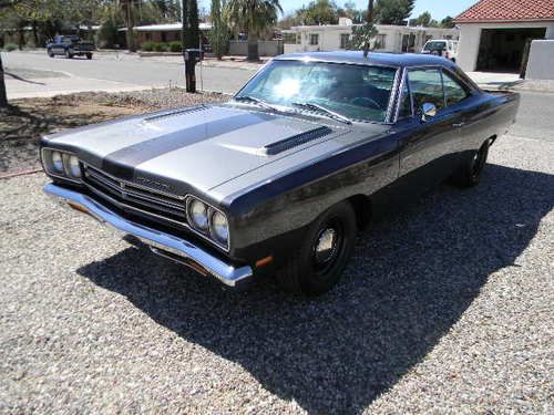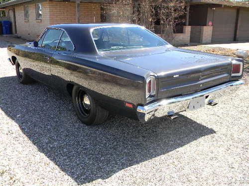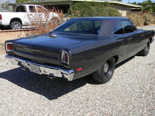 LISTING IS FOR A 1969 ROADRUNNER THAT HAS HAD A TOTAL ROTISSERIE RESTORATION . THE VEHICLE WAS BORN WITH A 383 C.I. AND A 4 SPEED. WHEN I PURCHASED THE VEHICLE, IT DID NOT HAVE THE ORIGINAL ENGINE. KNOWING THAT WHEN I BOUGHT THE CAR, A HEMI WAS IN THE FUTURE. I HAVE BEEN A BODY TECH FOR OVER 45 YEARS. BODY CONDITION ON THE CAR WAS NOT REAL BAD. I HAVE REPLACED BOTH 1/4 PANELS AND RT AND LEFT DROP DOWN PANELS. I HAVE ALSO REPLACED THE FRONT FLOOR SECTIONS AT THE DRIVER'S AND PASSENGER'S FEET. THE LEFT FRONT APRON DID HAVE SOME MINOR BATTERY ACID DAMAGE AND WAS REPAIRED. THE REST OF THE BODY WAS SOLID AND HAD NO OTHER RUST. I WAS PLEASANTLY SURPRISED THAT THE TRUNK FLOOR AND UNIBODY RAILS WERE SOLID AND REQUIRED ONLY VERY MINOR CLEAN UP. THE CAR WAS INSTALLED ONTO A ROTISSERIE AND THE REPAIRS BEGAN. I HAVE REMOVED EVERY NUT AND BOLT FROM THIS CAR. SOME ATTACHED HARDWARE HAS BEEN REPLACED WITH NEW BUT I DID CLEAN UP AND REUSE SOME ITEMS IF AT ALL POSSIBLE. I DID INSTALL RIGHT AND LEFT WELDED-IN SUBFRAME CONNECTORS AS WELL AS ALL FOUR TORQUE BOXES. ALL FRONT SUSPENSION COMPONENTS ARE ORIGINAL BUT BUSHINGS AND JOINTS HAVE BEEN REPLACED. THE TORSION BARS WERE REPLACED WITH HEMI BARS FOR THE ADDED WEIGHT OF THE ENGINE. ALL TIE ROD ENDS AND COMPONENTS HAVE BEEN REPLACED AS WELL AS A ONE INCH SWAY BAR. I DID REPLACE THE MANUAL STEERING BOX WITH A REBUILT CARDON POWER BOX... NOW THE FUN STUFF....THE ENGINE IS A 472 CRATE HEMI ENGINE AND WAS BOUGHT RIGHT HERE AT EBAY FROM AN ENGINE BUILDER IN NORTHBRIDGE , MA.AND IS ADVERTIZED AS HAVING A 525 HP, THEN SHIPPED HERE TO TUCSON. I ADDED THE MARCH SURPINTINE BELT SYSTEM AND ADDED AIR AND POWER STEERING. THE AIR IS A CLASSIC AUTO AIR SYSTEM AND BLOWS COLD A/C. THE RADIATOR IS A CHAMPION 4 CORE ALUMINUM WITH DUEL 12 IN ELEC FANS. I INSTALLED THE ENGINE AND DRIVE TRAIN. THERE IS A TTI 3" X PIPE EXHAUST SYSTEM WITH STAINLESS TIPS AND MAGNA FLOW MUFFLERS. ZOOM STREET AND STRIP CLUTCH AND PRESSURE PLATE. TRANSMISSION IS AN A833 26 SPLINE 4 SPEED THAT HAS HAD A TOTAL REBUILD AND IS QUIET AND SHIFTS GREAT. A HURST PISTOL GRIP SHIFTER AND LINKAGE HAS BEEN INSTALLED. THE REAR END IS A DANA 60 BUILT WITH STRANGE ENGINEERING COMPONENTS AND 35 SPLINE STRANGE AXLES WITH THE LARGE END BEARINGS AND 3.54 RATIO TRU TRAC .THE VEHICLE IS ALSO EQUIPED WITH SSBC 4 WHEEL POWER DISC BRAKES.THE INTERIOR HAS ALL BEEN REPLACED INCLUDING-CARPET-SEAT COVERS-HEADLINER-DOOR TRIM PANELS-UPPER DASH PAD. THE ORIGINAL SPEEDO CLUSTER HAS BEEN REDONE IN WHITE TO MATCH THE GAGES. ALL GLASS HAS BEEN REPLACED WITH FACTORY TINTED GLASS AND NEW WEATHERSTRIP WHERE IT WAS NEEDED. NEW AMD FRONT AND REAR BUMPERS, NEW GRILLE AND HEADLAMP DOORS-WIPER MOTOR HAS BEEN REPLACED. THE PAINT IS A 2 STAGE BASE COAT CLEAR COAT AND IS CALLED TITANIUM DARK METALLIC. THERE ARE MANY SMALL ITEMS THAT HAVE BEEN EITHER REPAIRED OR REPLACED DURING THE RESTORATION THAT IT WOULD BE IMPOSSIBLE TO LIST THEM HERE. THE RESTORATION TOOK ABOUT 2 1/2 YEARS TO COMPLETE. THE CAR HAS APROX 250 MILES ON IT SINCE THE COMPLETION. THERE HAVE BEEN SOME SMALL ADJUSTMENTS BUT I HAVE EVEN SURPRISED MYSELF HOW FEW. I DO HAVE THE CAR FOR SALE LOCALLY AND RESERVE THE RIGHT TO CLOSE THE AUCTION AT ANY TIME. I HAVE NO OBJECTIONS TO ANY OUT OF STATE OR INTERNATIONAL BIDDERS WHO WOULD LIKE TO HAVE AN INDEPENDENT INSPECTION. I HAVE SOME ADDITIONAL PHOTOS AND CAN ANSWER QUESTIONS IF ANYONE IS INTERESTED THROUGH MY E-MAIL LISTED BELOW. A $1,000 DEPOSIT WOULD BE REQUIRED FROM THE WINNING BIDDER WITHIN 48 HOURS. NO WARRANTY .VEHICLE IS SOLD AS IS WERE IS. STEVESBAD55@YAHOO.COM