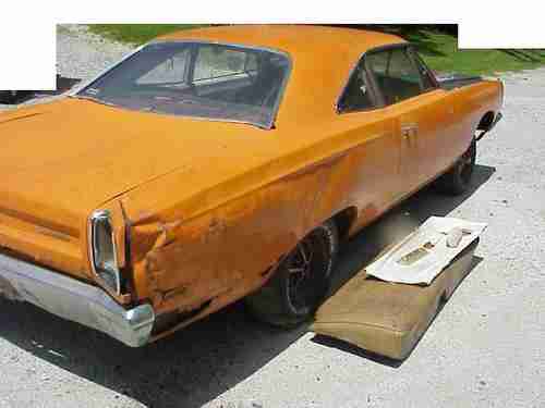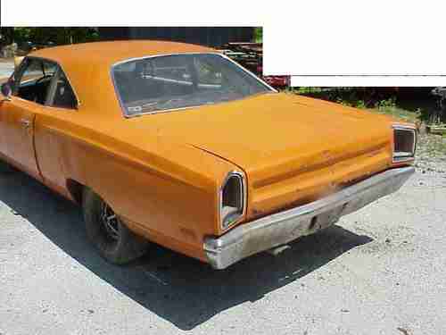 Hello, I'm selling my 1969 Roadrunner. I bought this years ago and just don't see getting the time to restore it. Real vitamin C orange car, factory 4 speed, tach in dash. No motor, trans, drive shaft, front seat all missing other things I'm not thinking of right now missing parts etc. What you see is what I have for the car. I found a rear seat but they are wrong color. The interior was white. Both doors only open from the inside, I think the rods have come off in door. Drivers window is off track but there. Vin tag was removed from dash by past owner who kept it in a unsecured storage unit and was afraid it would grow legs. I have the vin tag which matches the rad support number. The car has rust as you can see , it will need floor work, trunk work, quarters, rust at rear window. The lower rad support is torn and can be fix, from being pulled around years ago. Back seat floor tunnel has a rip from a drive shaft letting go. Rear frame rails are not to bad but may need a patch or so. The rest look good. There is a small area by on lower inner fender along frame rail that is just getting a small hole...easy fix.