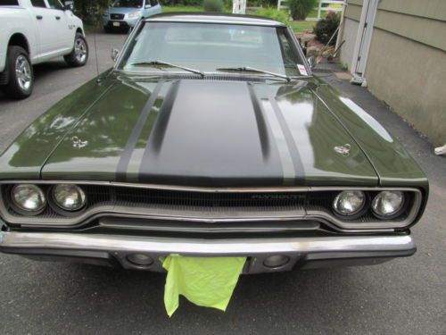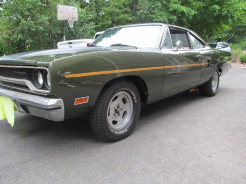 - 1970 Road Runner - Dark Green This car is not numbers matching. Its all steel, no bondo. This car is an off frame rotisserie restoration. Not perfect "show quality" but very respectable and fun to drive. Has original door handles, glass, steering wheel, dash and bumpers. Under carriage is extremely clean. The motor is a brand new rebuilt 440 with high performance cam and it runs very, very strong and with its exhaust set up, it sounds incredible. Car is missing a gas pedal and inner molding for the rear window and two gauges are not working. Any questions or need more details or pictures, please contact me. |