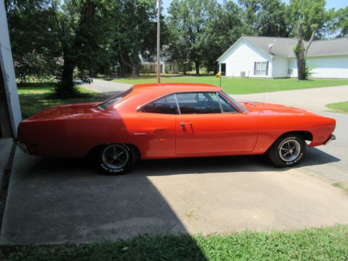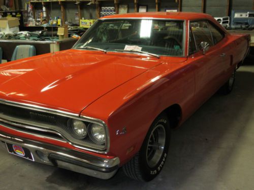 This is a very clean somewhat of a survivor car has only had 1 repaint back in the late 80's it is a real EV2 orange car with the deluxe black an silver trim interior ,, with only the seats an carpet being replaced still has the original dash pad door panels ect. and the steering wheel doesnt even have a crack in in like so many have .. it has a nice set of 14 " rally road wheels with the old school goodyear eagle gt tires with a matching spair ,, the spair in the trunk is an original polyglas goodyear not reproduction both will go with the car ,, this car also has a very nice buildsheet that has been laminated an framed .. it was an original 383 hp car now has a 72 440 init that runs good has headers but have the original manifolds to go with it ,, an I have a correct HP 70 dated 383 block as well .. This car is a very nice driver dependible all the gauges work except the tach an fuel only registers up to half a tank probably needs a new sending unit other than that it all works like it's suppose to..would make someone a cool high impact roadrunner to cruise around as is very presentible any questions call Jon @501-516-7710 thanks an good luck bidding ......