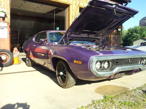 This is a real 71 Roadrunner, Originally a 383 car but now theres a stout “68” 440 between the fenders. This car is currently Plum purple but was originally Sassy Grass Green. Someone has made a amateur attempt to cover up some rust bubbles.The left front fender may need replaced and there is also rust on the body mount under the drivers door and around the rear window that needs to be addressed.