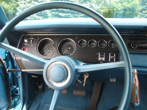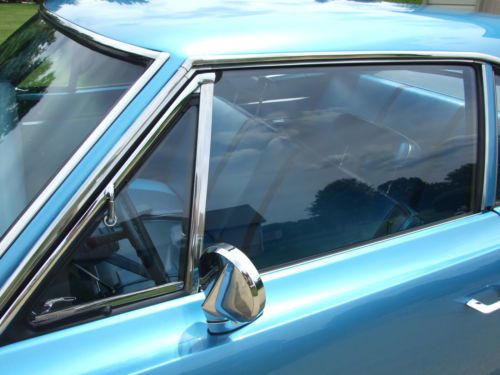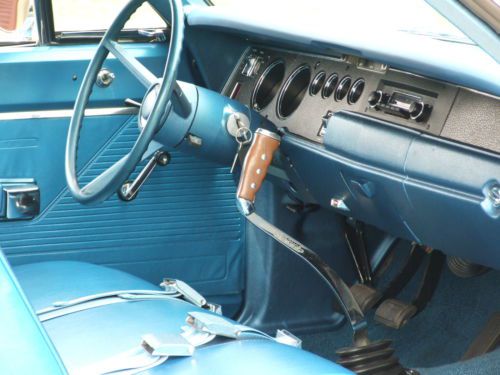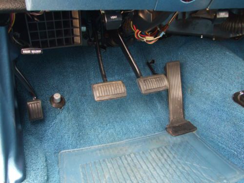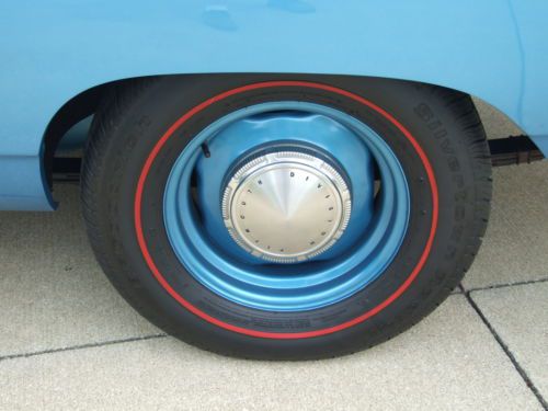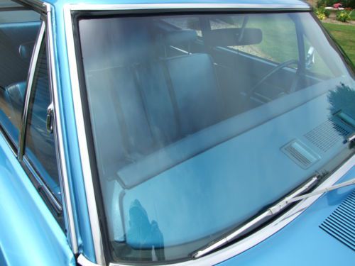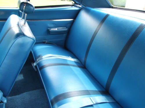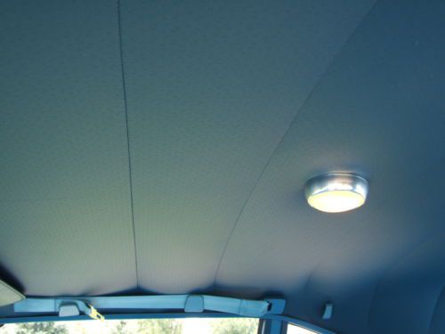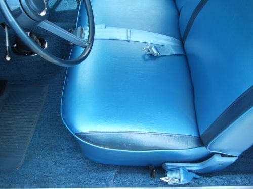 * Interior shows very little wear since the restoration project. * The sun visors work well and have a good solid backing inside of them, and material is good. * The headliner has all been pulled tight and has good solid seams without any tears. * Being extremely critical, there is a little bubbling on the material at the left and right rear corners where the material is glued to a backing of some type. (see pictures) * Door panels, dash, gauges look about as crisp and almost as new as you could imagine. (Current owner had gauges refurbished) * Carpet has lots of life left, and the blue has retained its coloring well. * Steering wheel does not show any cracks, and in general all the controls and switches show hardly any wear at all. * Looking at pictures up close will be your best indication.