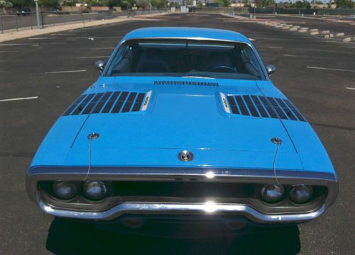 Real Deal 1972 Petty Blue Road Runner. Fully loaded with Factory Options including Air Conditioning, Pistol Grip 4-Speed and center console. Also has Power Steering and Power Front Disc Brakes, Posi rear differential and Factory front and rear sway bars . Extremely clean throughout with a highly detailed engine compartment. All fluids replaced. New clutch assembly. New front brakes, hoses, shocks, belts, etc. Starts immediately and runs excellent. Factory radiator just renewed. No overheating. Radial T/A's all around with Magnum 500 Wheels. Very nice paint and interior with very few flaws. Killer CD sound system with custom Amp enclosures in the trunk. Factory spare tire with jack assembly. The car is stunning to look at, and a really nice, solid driver NO RUST, and no signs of rust repair. Please call Mike at 480-773-2496 for more information and pictures. You will NOT be disappointed. No third party internet sales calls please. Seller reserves the right to remove the listing at any time.