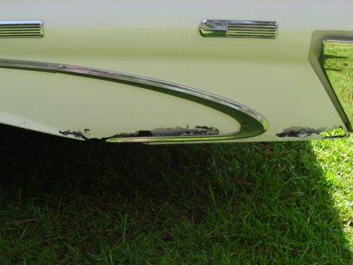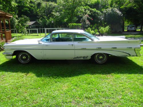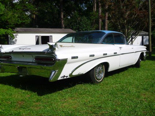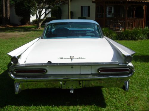 1959 Pontiac Bonneville 2 dr. hardtop coupe. 118,672 miles Equipment: includes power steering, power backs, hydromatic, full tinted glass (no cracks), AM radio, heater, back up lights 389 4-barrel Carter carb.(factory) 300 horsepower, factory duel exhaust safe-t-track (posi) differential, 3:23 gears - 31 spline axles Die cast headlight rims (not aluminum) Engine compartment is complete and factory stock Original keys Engine turns smoothly by hand. Rocker arms-studs-retainer nuts, pushrods in good condition Valve springs, retainers in good condition. All valves move freely. Oil flows to heads and push rods rotate as they should even when rotated by hand. Spark plugs were clean when pulled ( no carbon desposit) Starter is weak, will not turn fast enough to start. will need starter replaced for start up attempt. The car needs: Trunk pan, front and rear floor pans, should be repaired or replaced. Body panel repairs on the rust thru. tank to engine fuel line, brake rebuilding. I do not have the skill or material and the facility to do this work. Missing Parts: No head liner retainer rods are there. Courtesy light lenses, Pontiac letters between tail lights Arrow head body trim. The one I have is in the photo. The car has four new tires but they are 25 years old. I put tubes in them. No battery - battery box is deteriorated The Bonneville was given to a local resident by a former employer 35 years ago. He drove it for 5 or 6 years. The Bonneville was literally sealed in a all woodbuilding with a raised wood floor 24 years ago. We had to cut a hole in the wall to remove it. There are extra parts: front and rear brake drums that come with the car, extra brake shoes and hardware as well. I bought it because I had one like it 51 years ago. Sold on bill of sale. Georgia will not issue title if 15 years or older. Car needs to be towed or on rollback. Us small Ebay sellers only get 24 photos. I have many more photos mainly of engine detail and front end. you are free to come and inspect the car.