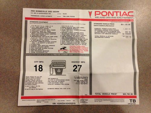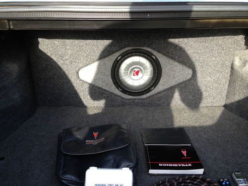 I am selling my 2002 Pontiac Bonneville SSEI with tons of extras! Leather, NAVIGATION, DVD, Back Up Camera, Remote Start etc... The sticker price on this Pontiac was $35,745.00 The car has a V6 Supercharged 3.8L engine. Low miles, less than 11K a year! It is automatic, never smoked in, HUD (Heads Up Display on windshield) Pioneer AVIC-Z1 Touch Screen 7" DVD, AM/FM CD MP3 Navigation, back up camera,J L Audio amp and 12" Kicker subwoofer mounted in the trunk, 30 GB Hard drive, voice activated Bluetooth cell phone integration, Sat. radio, ipod interface, 2 head rest monitors. ABS, Ice cold air, rear air, power tinted windows, power door and window locks, cruise control, power steering, tilt wheel, dual and side air bags, leather interior, dual power seats, heated front seats, heated mirrors, power sunroof, alarm, Onstar, fog lamps, 17" chrome plated aluminum wheels, tire pressure monitor, universal garage door opener. New front brakes, oil change and detailed! The trunk has a built in compressor with hose and gauge. Manual, First Aid Kit with extras, 2 keys with remotes. This car also has an onboard computer, digital compass, tracton control and rear spoiler. This car runs and drives awesome! You will not find another SSEI in this condition! I have the title in hand! This vehicle is for sale locally and will be removed if sold.