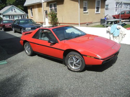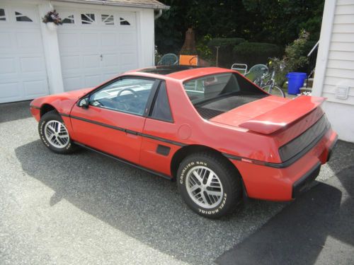 For Sale 1984 Pontiac Fiero Excellent Condtion with just 65,000 miles. Red with gray interior. 4 speed with a sun roof, power windows, factor mags, and air conditioning. Added Options: am/fm stereo cassette with equalizer, tilt steering, GT steering wheel, factory third brake light, rear GT spoiler, GT door and dash pockets, and factory time delay wipers. A brand new factory replacement motor was installed 10,000 miles ago