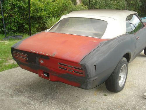 up for auction is my 68 firebird convertible this car is loaded with options like working power windows power top tilt wheel and rare fold down back seat . it has deluxe door panels deluxe seats and console clock . the clock housing is there but the clock is missing.the engine is not original to the car it is a 1975 400 yt that has been completley rebuilt and the trans is a 400 turbo .the car is in need of restoration but is well on its way . the previous owner had put new floor pans and trunk pan the quarters panels have been replaced but the front fenders need some repair as does the hood. there is rust on the dashboard panel but i have the new panel to replace it.the car needs some more parts like the front lower valance panel exhaust driveshaft .... i do have a brand new carpet to go with it and a new ignition lock and key . the engine has all new plugs new wires high out put hei . new belts /hoses and new battery. it also has a new demon carb and performer intake. it is close to being done but still needs some more work. the rear brake line just broke so now that needs to be fixed like i said this car needs restoration but it is going to be worth alot when its done ther are not many of these cars with options like this car has . the power top is working but very slowly the top itself is in decent shape . i have a clear title in previos owners name. the car does have frame connectors and just open headers for exhaust there is a new core support installed and battery tray . if you need any more info please ask .
