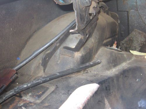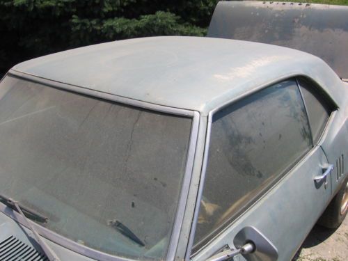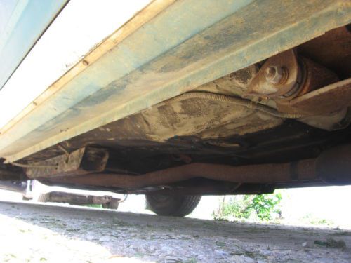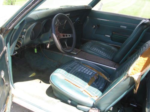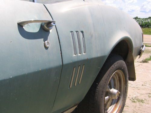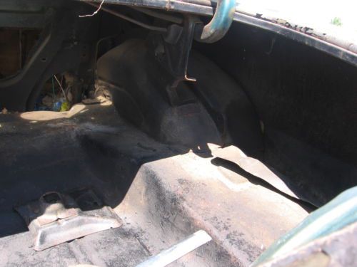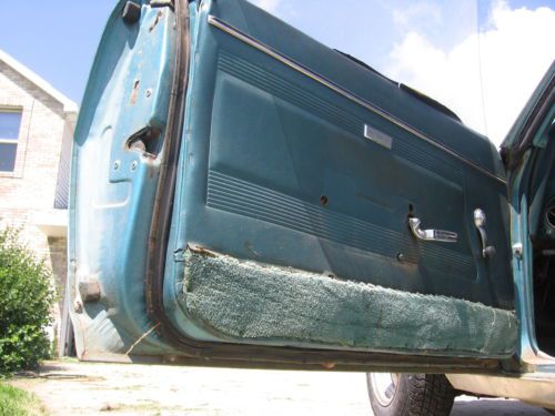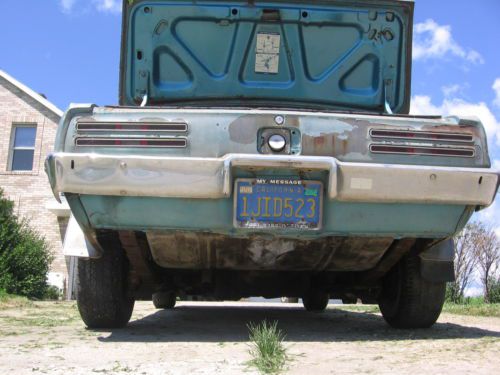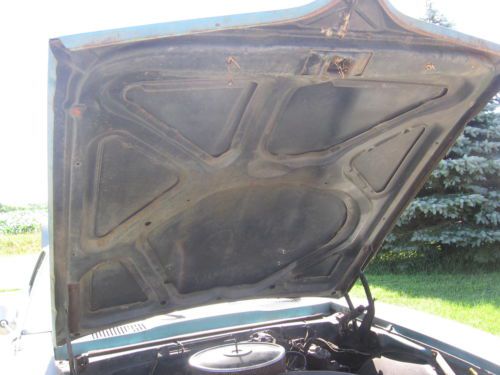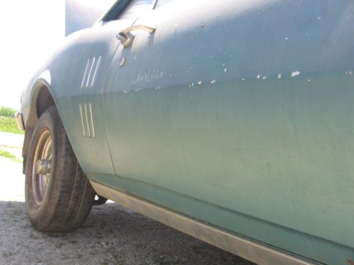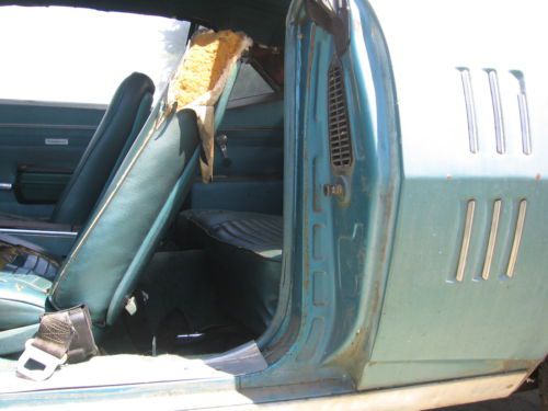 This car has been a California car that has been stored on pavement all it's life. The only corrosion I could find on the whole car was a small nickel sized bubble at the bottom of the right rear quarter where dirt accumulated. Besides that, the car is completely rock solid. The floors, quarters, trunk floor, rockers, and any metal on the car does NOT need patches, repair, or replacement. Very hard to find one this rust free that is unrestored. Body has had some bondo work on the upper rear pass. quarter by the lower right corner of the rear glass (as shown in pics), that will need to be cleaned up. Besides that, the body lines are nice and straight. Doors open/close and fit the car nice. Car is really pretty straight and original and complete. All the outside trim is there (the rear window trim is in the trunk). Interior and trim looks complete but pretty beat up. Those 14" cragars were put on there a long time ago. Fender tag is still in place. The car is a 261 trim code, which is turquoise interior. The outside paint code is K-K, which is Meridian Turquoise paint. Very cool combo.