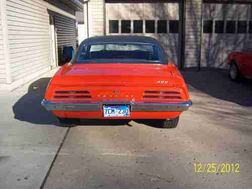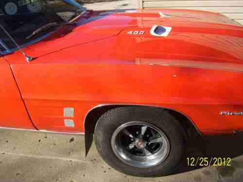 this a real 400 firebird,block numbers match vin,I have owned it for over 22 years.body was painted and engine was redone in about 1999 .30 over forged pistons. runs very good.a performer intake and 750 holley carb were added,original intake ,carb,aircleaner are included,no62 heads where given rework.hei distributor. have original.plastic around radio is cut,turbo 400 trans shifts very good but is leaking out of the shifter shaft,rear is 336 posi out of a 68 400 4 speed firebird,has a fairly new alburn posi,maybe have the original rear but i don;t know for sure. it is included but is mainly just the housing and center section power steering, power front disc,tilt,floor pan and trunk are good, no rust holes ,original 1/4s have some pathes in them, original vinly top has a few rust warts under it but not bad,a few seams separating,back seat looks in very good condition.fronts fair with some spliting,headliner has riped at the seams,new 1 and sail panels are included,a new none ac box was installed but has no fan or heater hooked up,new core goes with.pass side inner fenderwhell has some cuts in it and should be fixed or replaced, have almost all the original pieces to the a/c. the ac box is broken ,windshield has about a 8in crack on pass side,back windows need a little help rolling up,front headlight housing on pass side has a crack 1/4 panel on pass side has a crack in it,14in ralleys in front 15 in back. have the other two 14in that go with but i have lost the center caps,trunk leaks water,it has been inside every day since i have had it and i have always dryed it up upon washing,it runs and drives very well.very reliable ,it has maybe 15,000 miles on the engine rebuild,the odomitor on the speedo is stuck so i don,t know for sure.has headman headers on it, but the manifolds that where on it are included,also the steering colume shifter linkage is included.the buy it now includes, 2 -400 engines-a 70 400 that is mostly complete,and 76 short block, 12 bolt from 68-69 camaro has 373s and detroit trutrack+ any pontiac part that i have,starters ,flexplates,rims,distrubutors,ect funds must be clear before car goes,