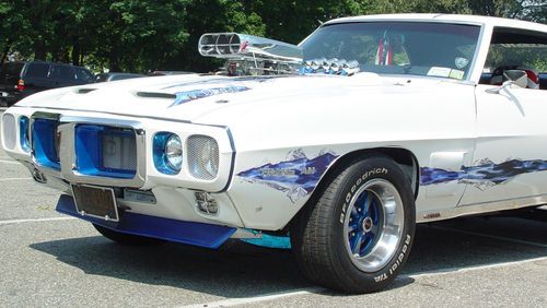 1969 Pontiac Firebird customized - 455 bored 060 over 469cid. #96 heads shaved 10 thousands and port matched. Stainless steel valves with hardened seats and 1:65 rockers. Ram Air 4 cam. Hooker super comp headers with 3" exhaust and dump tubes in front of rear wheels. Wenzler chrome plated tunnel ram with 2- 600 edelbrock carbs. Separate water crossover. Aluminum valley pan. Noisy timing gears. Chevy BB aluminum radiator with dual fans. Stainless steel firewall. Dual oil filters. Transmission and power steering coolers with 10" fans in front outside headlights. Turbo 400 with a 3000 stall converter and B&M shifter, manual shift reverse pattern & line lock. Chrome gauges on outside cowl. M/T ET Streets 30x12.5 on 15x10 Pontiac wheel vintiques mags. Front 15x8 Pontiac wheel vintiques mags. Stainless steel rocker moldings. New door and trunk weather-stripping. New trans-am blue metallic interior and headliner. New blue rug. New door panels front and rear. Shaved door handles. Custom ripped metal decal stripes. Fiberglass fenders with Trans am extractors. Fiberglass Trans am hood. Trans am rear spoiler. Custom decal on rear taillight panel.