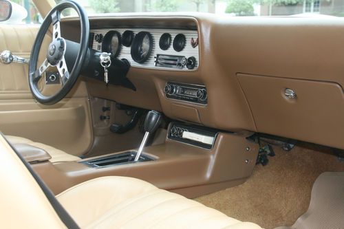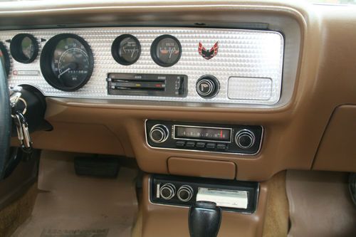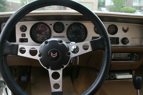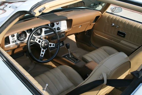 1977 Pontiac Trans Am with the automatic Pontiac 400 engine with 69,300 original miles. White exterior with buckskin interior. Second owner and purchased in 1987. Garage kept, stored winters. Exterior, interior and weather strippings are in excellent condition. Runs and drives great. Still have the original Uniroyal tires stored. Mounted Alpine stereo with USB connection in glovebox for excellent sound quality, but with the original AM Stereo and 8 track look.