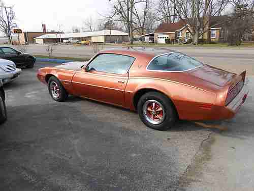 1980 PONTIAC FIREBIRD ,3.8 V-6 , AUTOMATIC ,CRUISE, A/C, 1 OWNER ALL ORIGINAL. PICS SPEAK FOR THEM SELVES. NICE OL CAR. ENGINE IS JUNK IT RUNS BUT HAS ROD NOISE. DOES NOT SMOKE. TRANNY SHIFTS GOOD BUT FRONT SEAL IS LEAKING. STILL HAS CONVERTORS AND SMOG CONTROL. ALL GLASS IS GOOD. EVERYTHING IN TRUNK IS FACTORY. VERY LITTLE RUST, UNDERNEATH CAR LOOKS GOOD. THIS CAR HAS THE MAKINGS OF A VERY NICE RIDE. PAINT IS DECENT FOR AGE BUT WORE. STRESS CRACKS UPPER QUARTERS. FRONT GRILLS ARE ROTTEN. ASKING $4500.00 BUT OPEN TO OFFERS. YOU WILL NOT BE DISSAPOINTED . YOU ARE WELCOME TO COME BY AND LOOK AT 508 NORTH MISSOURI AVE. IN CORNING, AR 72422
