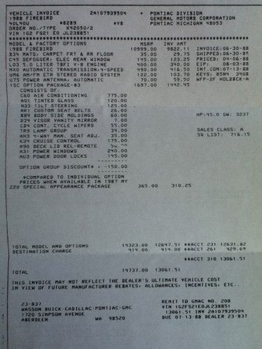 Very good original condition 1988 Pontiac Firebird with rare Z20 special appearance package. 89,860 original miles. The Z20 option was available on base model firebirds in 1988 only. Believe that possibly less than 800 were made. The car runs and drives well, nice highway cruiser. It is originally from the Seattle WA area and was brought to Montana about 10 years ago and has been mostly in storage since. The paint on the car and the wheel "spats" appears to be original and is in very good condition, but has some average, but minor chips and dings. The front and rear bumpers appear to have been repainted and show some very minor wear. The paint on the duck tail spoiler was largely missing/weathered when I got the car so I had it repainted. Car has very little to no rust. AC works but has intermittent operation, may need charge. Car has original R-12 AC system. Windshield washer bottle is cracked, holds only a small amount of fluid. Power door lock on passenger door sticks, works ok manually. Small crack in windshield on bottom right corner. The logo on the windshield matches the logo on the rear hatch so it may have come with the car. Dash is good, interior is good with exception of drivers seat which has some some small tears from seatbelt rubbing on seat. Headliner started to fall down and was repaired with needle and thread. Does not have original floor mats. All the options are working except for those noted. Car has new brakes, new tires, new hood and trunk lift shocks. To many cars must sell. Please email for questions, phone number, or vehicle inspection/test drive.