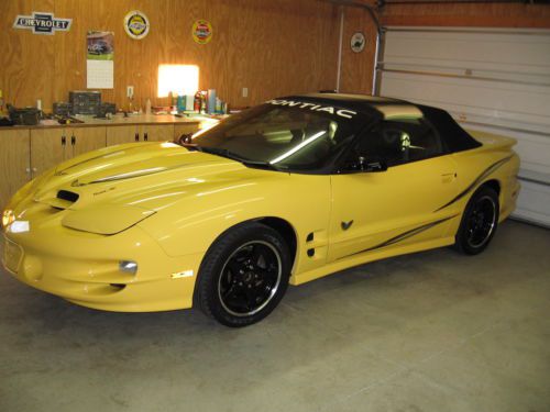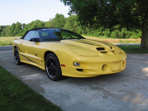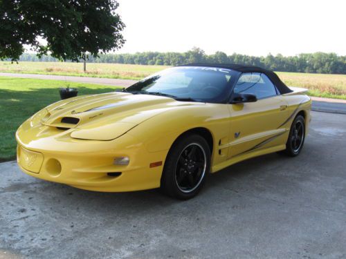 2002 Pontiac Firebird Collector Edition Trans AM Convertible WS6. This is the special edition for the last year the Trans Am was made. Pontiac literature states that 2000 Collector Editions were made; of those according to different scources about one fourth were convertibles. How many convertibles that were automatics I haven't been able to determine. There are many articles on the internet about these particular cars that make for interesting research. The Collector Editions have 17" wheels and P275/40ZR17 rated tires. They were loaded and had very little options left to choose. This one does have the performance axle option. Pontiac literature claims 0-60 mph in less than 5.5 seconds. I have garaged this car and it has not been driven in inclement weather. I have the original window sticker and all of the special stickers and literature that came with it. There is a model replica that is on the key chain. There is a carrying case for the convertible boot that can be used when the top is down. Also, there are 3 original GM lug nut covers in case one is lost. If you are interested in just owning a nice unique 1 of very few; or, taking this car to shows, you will not be disappointed. Everything works on the car. It is just simply a really nice vehicle that anyone would be proud to own. At $19,900 this car is priced to sell! If you would like more info or to make an appointment to see it, call 765-610-7354