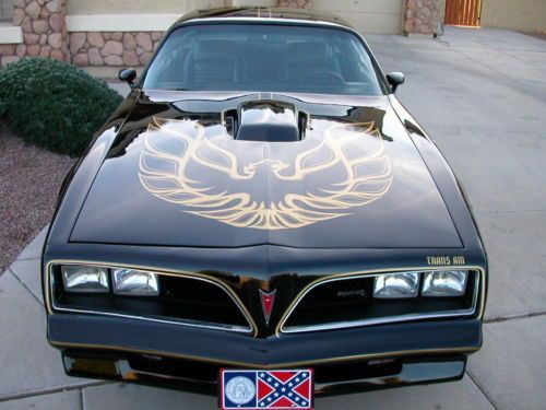 For sale by private owner from my personal, meticulously maintained Trans Am Collection in Chandler, AZ -No Dealer/ Auction fees -No Sales Tax * Pontiac 6.6L 400ci engine. Starts right up every time, and runs smooth and fast. Ready to drive across town or cross country. * Automatic Transmission * Power Windows/ Power Locks * Factory A/C with all new components... Blows Ice Cold * Factory Heat/ Defrost ... Blows Hot * Factory AM/FM Stereo * Cruise control, Tilt Steering Column * Power Steering, Power Brakes * Deluxe Leather Interior- All New * New Gold WS6 Snowflake Wheels The restoration on the car has just been finished. The whole interior is all new... Leather Seats, Headliner, Carpet, Gold Steering Wheel and Gold Dash Bezel, All emblems, etc. The body is solid and straight. It has recently been treated to Starlight Black base/clearcoat paint, then machine buffed to a deep, mirror finish. Decals and striping are new also. This car needs nothing. It's ready to hit the road with the turn of the key, and with working heat and A/C, can be driven any time of year. I'm happy to assist with shipping the car. If interested, you may call/text 48O-678-3837 with any questions.- Dave I also have a Black/Gold Anniversary Edition 1976 Trans Am LE Replica, and an Atlantis Blue 1979 Trans Am-Rotisserie restored to new. Click "see other items by this seller" to view. |