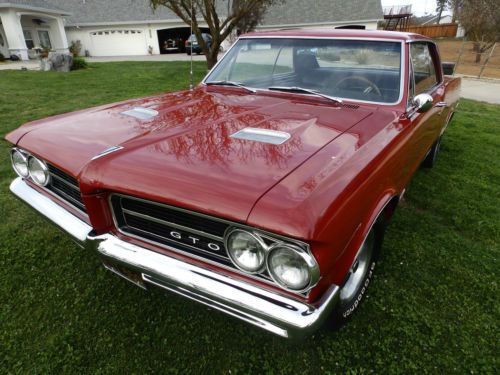 1964 Pontiac GTO. Red with Black interior, Original interior showing little wear on drivers seat and cracked on top of rear seat, 389 engine freshened up with new rings and bearings, valves overhauled, new camshaft, lifters and timing chain and oil pump. No rust, paint in decent condition, new tires on 15" rally wheels Relucted sale Call for more information 925 989 7979 |