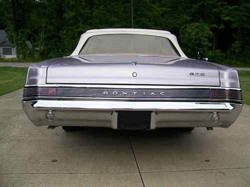 You are bidding on a 3 owner 1965 Pontiac GTO Convertible with 53626 miles as actual. PHS documented original engine 389 tripower with a automatic transmission. Finished in its original colors Iris Mist with a Parchment and Black Interior and still sporting its original dated white soft top. This GTO was purchased new 6-29-65 from West Side Pontiac, Lakewood, Ohio. The 1st owner kept the car 1 year and traded into Robert Lee Ford down the street, The 2nd Owner now in his 80,s purchased it from the Ford Dealer July 12, 1966. We purchased the car from him. We have the original 1965 Pontiac Warranty Protection Plan Protecto Plate Booklet and title copies. Very nice driver and appears to be no hit body. Paint was done in laquere in the 80,s and still shows very nice. The Interior is all original except carpet. and shows light aging but has no rips or tears. The original convertible top canvas has no tears but shows aging and the back window is yellowing but is the dated original and I just hate to change it. The Car was in storage for a few years so we recently serviced the car to include: Engine tune-up, engine oil and filter change, transmission reseal, new transmission cooling lines, radiator flush and boil, new radiator and heater hoses, Alternator rebuild, new manual tri-power linkage, tri-power air cleaners, and valve covers, re-chrome front bumper, new outer door handles, new emblems, new exterior mirror, new power top motor pump-hoses-2 pistons, engine detail, complete new duel exhaust, brake inspection and adjustment, new 14' Rally 1 wheels-centers-trim rings from Coker tire, new carpet and trunk mat, complete paint buff and detail. Also have picture book of paint restoration in the 80's. Please call 1-440-748-1500 for any questions. Will help in locating transportation. Will expect a 10% deposit within 3 business days and full payment within 7 business days if GTO meets our fair reserve