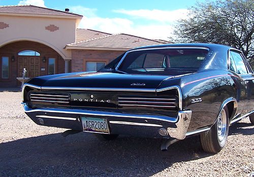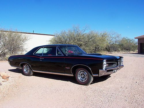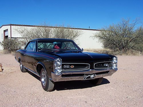 1966 Pontiac GTO, 2 dr HT, black with maroon interior, vinyl seats, power brakes, power steering an after market am/fm radio (the original radio is still in place). To the best of our knowledge, the 389 engine #G174 was manufactured in 1964. It is a 4 speed. We completed a frame off restoration in May of 2010, two days before we drove it on the Route 66 Fun Run. The car drives great, and looks great. We have won numerous awards with it, including 1st Junior at the AACA 2010 spring meet in Tucson. The car was painted just before we purchased it in Sept of 2009. It is black and shiny, however if you look real close and the sun is just right, you can see a few flaws in the paint.
