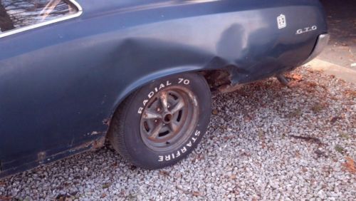 This auction is for a 1967 Pontiac gto that has been hiding in a barn since 2000. I got the car is PHS registered and it is a low optioned car. The car was originally mariner turquoise with a turquoise interior with a 400 and a muncie m20 wide ratio 4 speed with 355 posi. Car has no power steering or power brakes or ac like i said low option car made to go red light to red light in a straight line. The front grills are in good shape with no cracks like most others have. Some of the options on the is push button radio with rear speaker car also had the deluxe hub caps from the factory and soft ray windshield and all the glass is original and in good shape no scratches or cracks. THE CAR IS A TOTAL PROJECT!! car was running and driving in 2000 before parked in a barn. The car now has a Pontiac 455 with the 66 heads on it which comes back as 71 455 heads but i believe the motor its self is a later model motor in it with a 1968 to 1970 muncie 4 speed in it i do not know if it is a m20 or m21 or m22 i just looked up the numbers on the case and that is what it came back as. The 455 is missing the air cleaner and cab it was like that when i got it. I do know the rear end is posi but im not sure if the rear end is original or not i do know the motor and tranny are not original to this car!! car has a Pontiac hood tach on it but is not original to the car they cut the hood to stick it on the hood could be fixed easy. the drivers side fender is solid and the trunk deck is solid with some surface rust in the lip the car will need both quarters and inners replaced with trunk pan and all new floor pans the frame is solid with no holes.The core support and front inner fenders are nice with no rust. The car is sagging a little in the back because it has air shocks and the lines for the air shocks are missing.The drivers side quarter panel is beat up a little due to the wheel coming off of the car. Car is old and beat up but worth saving i do not need to sell just found another car i want please under stand the car is a project that needs totally restored. I have clear title for winning bidder if car sells any questions please email me i will do my best to answer all questions and send specific pictures if you need them thanks happy bidding. ps looks like someone over the years cut the hump in the floor to make that after market Hurst shiftier fit