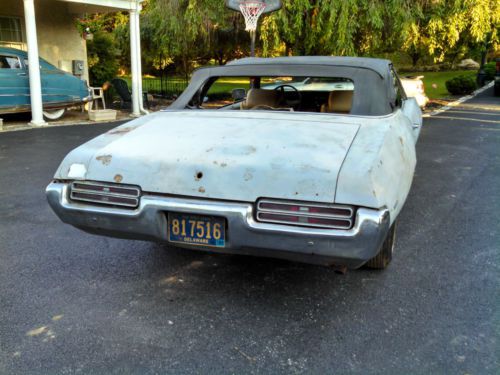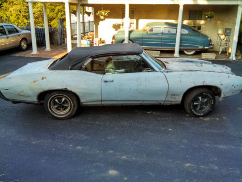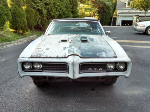 1969 GTO Convertible. We have owned this car for 23 years and have always planned to have it restored but never got around to it. Very solid car for the most part. Floor pans are a little thin in spots. Trunk is solid. Most of the body panels can be repaired instead of replaced. Car is original silver metallic with pearl white interior as far as I know. I don't believe it's the original motor, previous owner said it was a 428. Car has been sitting in storage for years in it's current condition. Motor is current not running, missing the drivers side window, radiator, water pump, and power steering pump. Trans is a 400 turbo with a 10-bolt posi rear. Disc brakes, power steering, power top. Car comes with rear spoiler, convertible top rubbers, and other misc. parts shown in the picture. Factory hood tach included. Hide away head lights with original T3 bulbs. This would be a great car to restore. Sold AS IS with no reserve to the highest bidder and PLEASE be able to complete transaction if you bid. Please email or call with any questions. 302-540-0391 Thanks. Jimmy.