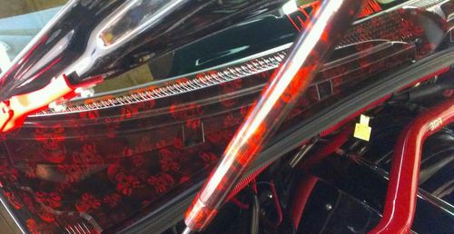I will break down everything done to car first on the outside: Front and back billet grilles, 18 inch staggered wheels, all the rotors brake brackets and calipers have been painted so it's all nice and clean, all polished emblems around whole car, underground neon lights, custom cowl hood with flame paint job, windshield wiper cowl was all hydro-dipped. Interior is two tone red & black, has painted trim and red & black carbon fiber pieces, chrome pieces, chrome b and m custom ratchet shifter, 7 inch flat screen DVD cd player and gps, gator pods and triple pods with all auto meter gauges. I put a brand new steering wheel on, all leather interior and is in perfect shape, no rips, tears, no one rarely sat in passenger seat, no one ever sat in the back. Custom Lloyd floor mats with billet clip downs, all hidden red theater light neons, the suspension is stock except I put the drag bags in back, the exhaust is kooks 1 and 7/8 ceramic coated long tube headers and has magna flow cat back system with 4 inch rear tips motor.