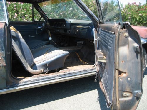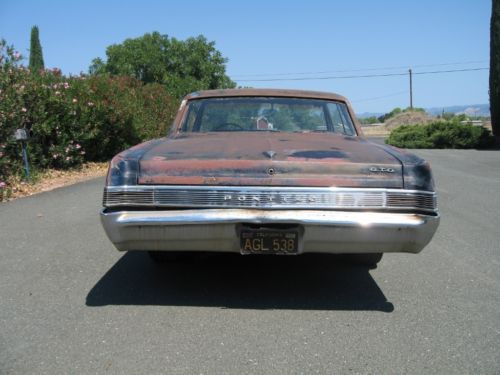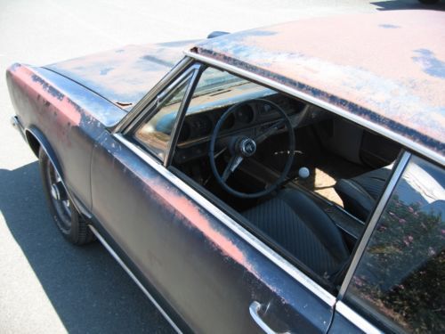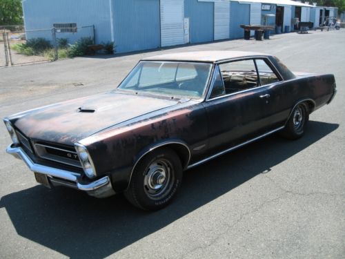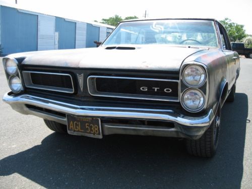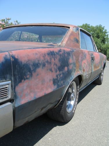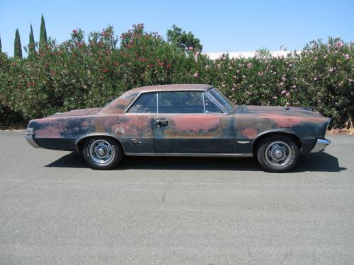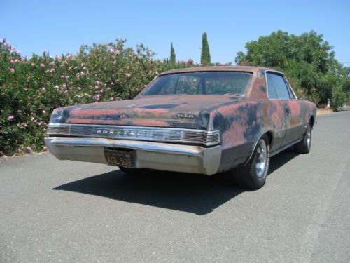 Restorable true 1965 Pontiac GTO. The car was built November 20 1964 at the Fremont plant here in Northern California. It was parked outside in the Central Valley area of Stockton California somewhere around 1973 until just this year. The old goat wears whats left of the original paint which is Nightwatch Blue (E code). The motor thats in it is not the original 389 4 barrell but a Pontiac 350 from a Firebird, and it is frozen. The rest of the car looks to be complete and totally original including the clutch set up, 4 speed and rear end. The car suffered a large tree dropping leaves all over it for the last 40 years which eventually rusted out the A pillars and around the windshield and back glass. The rest of the car as far as rust issues is what you would expect of a Northern California car - Frame Inner Fenders Rockers Doors are all good - minor rust at the floor pan, right quarter and trunk. I purchased the car recently with plans to leave it as is. I would install a cage, monster running gear and run it. Those plans are still in place but it is a real 65 GTO and after getting it back into my shop I realized it could be restored. I figured I would give you folks a chance to save it before I start the project. I can always find a Tempest or Lemans down the road for my "Rusty Relic Racing" idea it doesnt have to be the real deal. Reserve is set at what I have into the car down to the penny, if reserve is not met the cars mine. Clear California title in my name in hand - Car is currently licensed and registered in California. Thanks for checking out my auction. If you need specific pictures of any areas or more details dont hesitate to "ask seller a question". Car is sold where is as is with no warranties expressed or implied. Shipping costs are buyers resposibility although we will make sure its loaded onto your carrier properly. If you need help with transport, ask. We may be able to help find a good one for you. Payment in full within 5 days by cash in hand, wire transfer or check. NO PAYPAL Best of Luck
