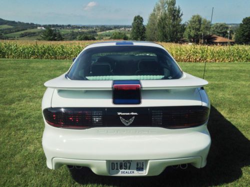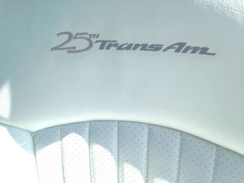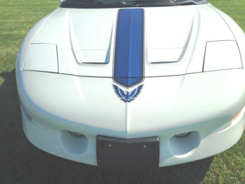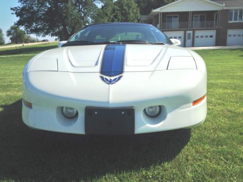 This is a Sweet 1994 25th Anniversary Edition Pontiac Firebird Trans AM. It has under 600 yes 600 Miles The pictures do not do this car justice, it is a real head turner. What a great investment that you can drive, enjoy, and show at car shows. 1994 marked 25 years of unbroken Pontiac Firebird Trans Am production, and to commemorate the occasion Pontiac created "A blast from...the future" 25th Trans Am. In addition to the high level of Trans Am GT features, the Anniversary coupe and convertible models included a bright white exterior, bright blue centerline stripe and front fascia emblem, a gray 25th Anniversary decal and bright blue Trans Am door badge, and specific 16" 5-spoke white aluminum wheels with Anniversary badging on the center cap. Inside, white leather seating areas include "25th Trans Am" embroidered in blue on the seat backs. The embroidery is also included in the door inserts. The blue centerline stripe on this 25th Anniversary Trans Am harkens back to the first Trans Am, introduced in 1969, that sported twin blue racing stripes from nose to tailpipe. All 25th Anniversary 1994 Trans Ams were high content equipped-loaded vehicles and powered by the GM 5.7 Liter, sequential port Fuel Injected V8 with 275hp and 325 ft/lbs of torque. The White Leather Interior is a beautiful compliment to the Bright White Exterior. The seats are in excellent condition with no sign of wear . The front seats and door panels have the 25th Anniversary Logos Embroidered. The Interior is very nice with a great sounding stereo, Power Everything and Ice Cold AC. All of the Gauges and lights seem to be functioning properly. The 5.7 liter LT1 Motor pushes out 275 hp and 325 ft lbs of torque. This is one of only 1,412 models produced with T Tops it is one of 2,000 total models produced and an even fewer of models produced with automatic transmissions VERY RARE BIRD - a great Collectible that you can still take out on the Street and enjoy. Please feel free to contact us with any questions on this vehicle at 563-599-0121 Thanks for looking - if you like older Trans Am cars, check out our other listing for a 1981 Trans AM with 22,000 original miles.