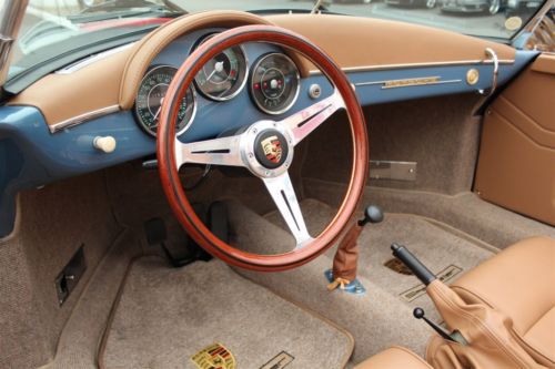 This turn-key 356 Vintage Speedster Replica re-creations is among the finest available, built in 2008 and finished to mimic and original 356 -- minus the six-figure price tag. This example is finished in Aquamarine Blue over a Tan colored interior. This 356's Tan interior features matching 356 Speedster floor mats, a wood Nardi Steering Wheel, VDO Instrumentation, hand brake and lap belts. Outside, it features Porsche crested "Super" hub caps, authentic badging, head lamp grilles and front and rear bumper guards. All of our Speedster re-creations feature a reinforced fiberglass body, safety glass windows, soft top, full lighting and a VW chassis. The Front Hood belts, Tan Colored as well, have also been added. Powering this 356 is the larger of two available engines, a dual-carbureted 1915cc air-cooled H4 engine. The engine is backed by a 4-speed manual transmission that features optional 3.88 "Freeway Flyer" gearing. |