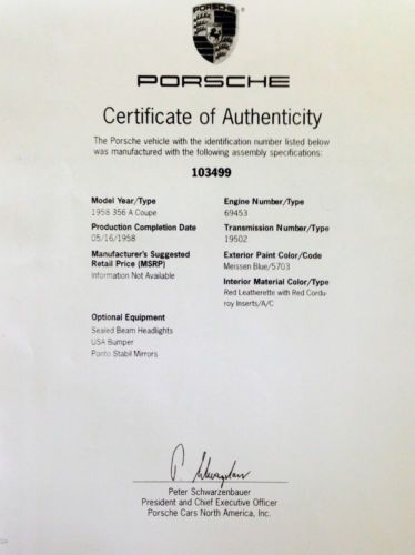 This is a Meissen blue 1958 356 A. This car was brought in from Europe to Tucson Arizona. The original owner had a two-year job in Palo Alto California. Other than that the car spent it's whole life in Arizona. The second owner acquired the car in 1976. The car was never driven until four years ago when it was purchased by the current 3rd owner. Current owner put a complete interior and headliner were done by Autobahn interiors of San Diego. This cars original paint color is Meissen blue it has one repaint. It also retains original engine, transmission, wheels, and hubcaps all are properly date stamped. Includes maintenance manual, owners manual, and toolkit. In 1970 this car received a lacquer paint job over the original blue paint. Other than the drivers door being replaced the car appears to have absolutely no accident Front or rear or rust. The stack of invoices from day one are 1 inch stick. A logbook goes back to day one on this car. All the original Porsche keys are with it. We put video's up on YouTube they can found here if you search Porsche Arizona Meissen. Porsche Arizona Meissen 1 Porsche Arizona Meissen 2 Porsche Arizona Meissen 3 You can call Chuck 520 977-5394 |