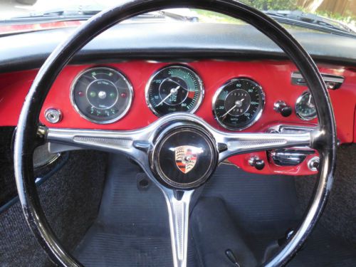 Authentic 1964 356C Coupe. European edition. Always a California car. Original California registration with black license plates. 3rd owner of vehicle; owned since 1983. Older restoration (1998). Comes with spare tire with chrome wheel, luggage rack, tool kit, jack stand, service cover, owner’s manual and repair/service records. Runs and drives superb. First time offered for sale. Coachbuilder/Bodyworks: Porsche coachwork. Serial #129529. All serial numbers for deck lid, trunk lid and doors match. Straight body with excellent panel gaps. Original floors, longitudinals and battery box. 100% original solid undercarriage in excellent condition. Only 2 rust dimples along bottom of passenger door (see photo). Interior: Black leatherette interior with original steering wheel and working Panasonic 12V radio with 6 to 12V converter. At time of restoration replaced headliner, carpet (with original black/grey German square knot weave), rubber floor mats, tunnel mat, dash light, turn signal/blinker switch, clothes hooks, defroster covers. Also rebuilt & reupholstered front driver and passenger seats (Autos International), installed new rear upholstery panels and reupholstered dash. Repainted supports for seat rails and shifter housing. Recently rebuilt speedometer and odometer instrument (2011). Exterior: Color: Ruby Red (original stock color). Completely stripped and repainted in 1997. 15” wheels (chromed, but some areas of rust). Yokohama tires with good tread but old and probably need replacing just to be safe. At time of restoration replaced rubber seals (front and rear windows, door handles, headlamps, back-up light, license plate lights, bumper guards, etc.), furry weather strips, soft channels, hard channels, horn grilles, muffler and tail pipes, tachometer cable, covers and lens, deco strip molding (front & rear bumpers), emblems, tire strap and side mirror. Also rechromed bumper guards, exhaust tips, door handles, front turn signals, license plate light covers, some window trim pieces. Engine: Original, model year number matching (Serial #P731834), 1600cc Normal engine (rebuilt in 1990). Odometer reading 64, 034 miles; however, odometer and speedo were broke for a number of years. I estimate the car to have approx. 120K on it. Zenith NDIX carburetors. Approx. 60,000 miles on rebuild. During rebuild replaced original non-counterbalanced crankshaft with counterbalanced crankshaft, generator (original crank to be provided to buyer). Rebuilt carburetors in 2011. Engine runs good and strong. Compression 120-130 on all 4 cylinders. Engine sheet metal, fan housing, air filter housings and heater boxes all powder painted. Still has original engine compartment insulation. Electrical: 6 volt electrical system. Replaced generator, starter, ignition switch and battery. Hydraulics: Koni shocks and steering damper. Replaced master cylinder and hoses. Recently rebuilt rear wheel calipers. Suspension: replaced stub axel and suspension arm. Replaced axle boots (2011). Priviate Party Sale. No warranty expressed or implied. Sold as is, where is. Buyer is responsible for all shipping costs and arrangements, and any California state sales taxes and license fees. All sales final. No returns. For U.S. buyers a 10% non-refundable deposit (Bank wire transfer) is required within 3 business days of the auction’s end, the balance to be paid within 7 days of the auction’s end. Foreign buyers must pay in full within 7 business days of the auction’s end. |