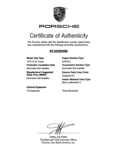 1970 Porsche 911 E, Restored, Coa, #'s Matching, Correct Tangerine, Records on 2040-cars