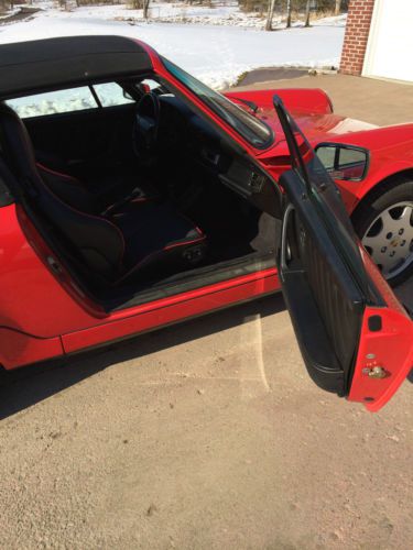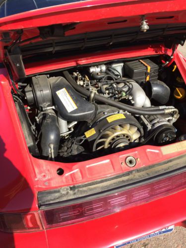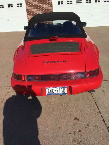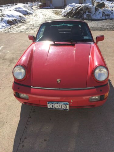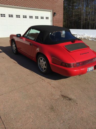 1990 Porsche Carrera 4 in Very Good condition! Original Guards Red paint with average wear and tear for its age, 51,152 miles! Never seen winter, Always Garaged. Has black Leather seats with red piping. Interior in Very Good condition, Everything works as it should, Dealer maintained with no expenses spared. Runs Excellent, Transmission shifts smooth, Brakes are Excellent, Tires Replaced at 50,000 miles, There are 2 small tears in soft top, does not leak, should be repairable. Tonneau Cover excellent. Tool kit, Owner's Manual, Spare included.