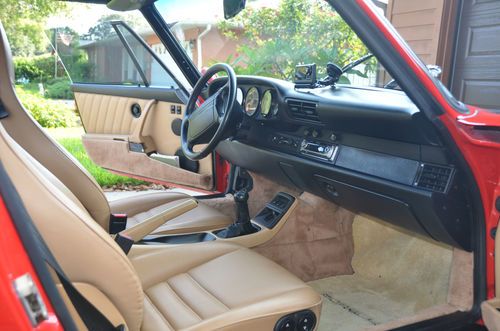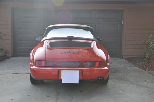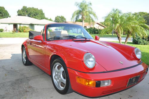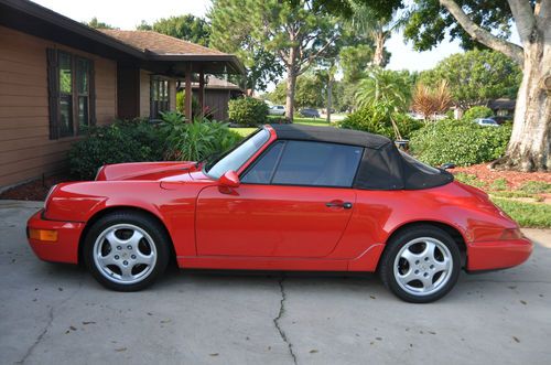 1992 Porsche Carrera 2, red Cabriolet, 964 air-cooled 3.6 liter engine, 5 speed manual transmission. Very good to excellent condition. 79,200 miles. Modification : original radio replaced with satellite radio. Florida Car, 2nd owner. 17 inch wheels; spoiler raises and lowers depending upon speed. Blemish from parking lot encounter on left front finder (see picture). Car Fax available.