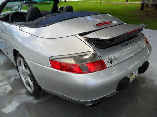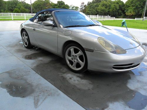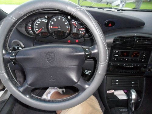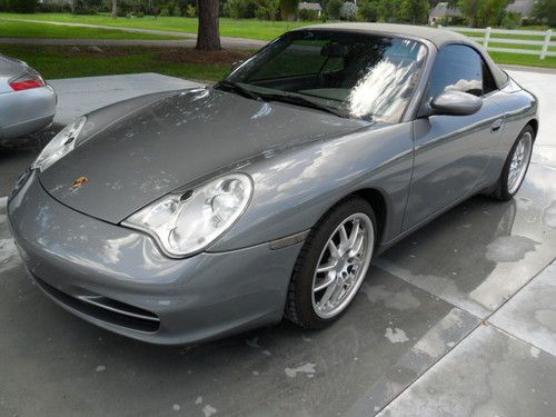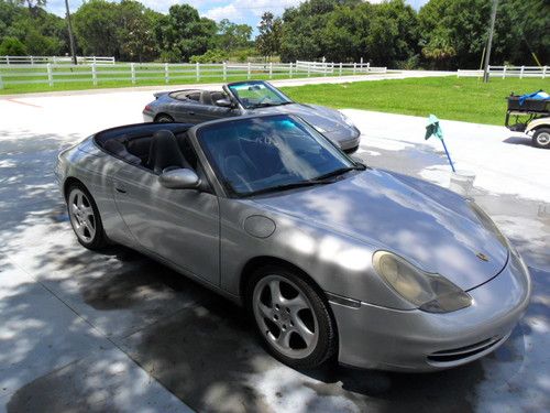 My Wife is selling her 99 911 Carrera Cabrio convertable, has new dark blue top w/ glass rear window, 6-disc changer, all Dark Blue leather, Texas car until she purchased 2011. has driven only 4K miles since purchase. 18" light Alloy Turbo wheels with 80% rubber "Z" rated tires,, Garaged, Has all the Porsche options offered for 1999 911 series. This has been a Good Weather - Sunday driver / toy for us. We also have a 2003 Cabrio model (Mine-PICTURE IS ENCLOSED / $26,000) we may be also selling (Ext dark Grey - Light grey leather interior). Car is currently located Sarasota FL. It has a clear title and car fax. Non smoker car(Both allergic to smoke). Original list on this car exceeded $90,000+ Any questions..941-322-1481 or cell 228-547-9296