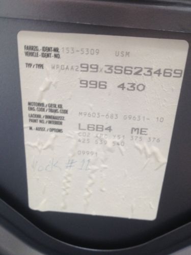 This 2003 Carrera 4S is in excellent condition with factory option sport seats, full leather interior & 19 inch mesh design wheels with some real fat 295/30ZR19s on the rear. front & rear tires are like new. The brake pads have 75% or more life still in them. the clutch & radiators have been replace in the last 2 years & the intermediate shaft bearing was replace with the LN Engineering updated bearing. (a real bonus and a must do on a used 996) 60k mile service was also done. The second to the last picture is of the option sticker under the front hood, the last picture is of the scratches on the rt. ft. valance. Seller reserves the right to end the auction early as it is for sale locally. Buyer is responsible for shipping. The car can be see at European Motorsports were all the repairs have been done. If you have any questions you cal call Joe at European Motorsports 760 599 9307