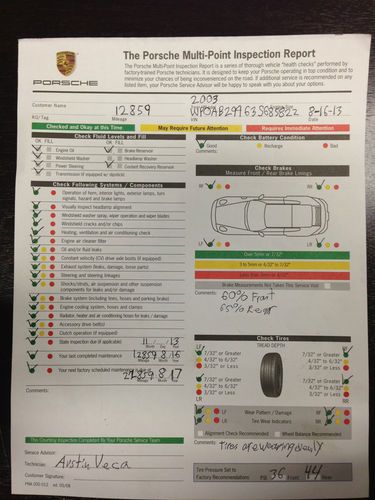 The car just had its major service on 8/16/2013. The total was over $1,000 and it was performed (as all its services have been) at an authorized Porsche dealer. If you would like to see a copy of the itemized service receipt, just shoot me an email and I will send it to you. It consisted of the following: