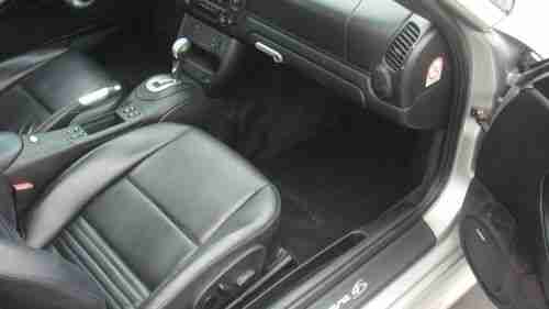 THE PORSCHE HAS A SILVER EXTERIOR WITH A BLACK LEATHER INTERIOR AND BLACK CONVERTIBLE