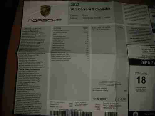 You are viewing perhaps the nicest 2012 997.2 Carrera S 6 speed anywhere. Just over 4 full years of factory bumper to bumper warranty remain- better than what you receive on a brand new 911. One Porsche Club of America member owner. Always garaged- I mean every single night of it's existence. Hard to believe, but I don't think the windshield wipers have even been used. Very well optioned, with one of the 3 top selling Carrera color combinations. Absolutely no stories. No stone chips, dings, dents or other flaws. Will be sold freshly Porsche dealer serviced including the 2 year brake fluid flush. The car has a fully upgraded exhaust to give it a proper (i.e. amazing) sports car tone- but if you'd prefer a boring sound I can switch it back to the factory exhaust without a problem since I retained all of the parts. I am serious when I say if you're in the market for a stone-cold awesome 911 then you will not find a better one anywhere. I have tried to include several good pictures, including underneath the car which clearly shows the level of showroom-new this car is. No oxidation. Shiny. Excellent! Look underneath some 911s and you'll see why I included this picture. The car is owned free and clear, has a factory indoor car cover, Weather Tech floor mats, 2 sets of front and rear Porsche factory floor mats (yes, 2), both keys, OEM Porsche battery maintainer, all records and all brochures (including the rare hard cover one), clear European side market lights (a must), and has generally been shown a level of care few 911s enjoy. All 4 tires are patch free. The window sticker in the final picture should be able to be zoomed in on to see the complete list of factory installed options. $110,775.00 Please message me with any questions. I think I've priced this car very very well especially in light of the fact it has a pricey upgraded exhaust system, it's pristine condition would be almost impossible to surpass and the fact it has 4 full years of transferable factory warranty remaining.