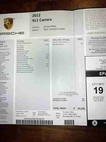 Beautiful 2012 911 Carrera in Carrara White with Black Leather Interior. Well equipped with Comfort Package, Infotainment Package, 12-Way Power Seats, Heated Seats, PDK(Auto) Transmission, 19" 911 Turbo II Wheels, BOSE Surround Sound, Navigation, and Sport Chrono Package. Like new. Only 1650 miles, and driven only on nice dry days. Stored in a heated warehouse. Still smells new. Always hand washed and chamois dried.
