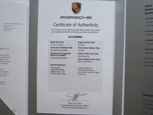 If you are looking for a 1973 Porsche 911T Coupe in incredible condition with MFI, at an affordable price, then this is it. Wonderful condition both inside and out, with provable low miles and only 3 owners. Fully documented service history, rebuilt engine and gearbox 3,500 miles ago, all original books, manuals, service records and tool kit. This fabulous 1973 911T Coupe has the much sought after Mechanical Injection System, or MFI. The car was delivered on the 6th of February 1973 from Chick Iverson Main Porsche Dealer in Newport Beach. It is a three Owner car, last owner since 1986, with full service records, including all original documented service books, manuals, full service receipt, tools, and 5 matching dated Fuchs wheels, it is of course an accident and rust free car, all panels are perfectly arrow straight,the doors close with the Porsche Ping, there are no stone chips, dents or scratches, and the panel fit is exemplary, and has always been garaged. The car had one windows out repaint some 20 years ago, and still looks brand new, and has retained it's emission control sticker. Recent work includes full engine and gearbox rebuild with receipts in December of 2007 at 9,230 miles, and having only covered 3,550 miles since, I recently drove 957 miles recently ,and the car performed perfectly. The car comes with the Certificate of Authenticity, showing it is matching numbers. This car is 40 years old, and although in excellent above average condition, it is NOT a new car, Please keep your expectations reasonable, you will not be disappointed. The car is sold as is/where is. Overseas buyers welcome, and I can assist with shipping if required. I reserve the right to end the auction early if the car sells prior to the end. Private plate does not come with the car. Please ask all questions and carry out all inspections before NOT after the auction ends. |