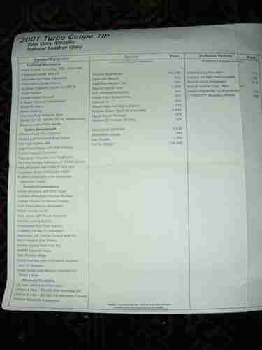 I AM THE ORIGINAL OWNER OF THIS 2001 996 TURBO. IT HAS NEVER BEEN CRASHED, REPAIRED OR PAINTED. EVERYTHING IS ORIGINAL EXCEPT FOR THE UPGRADE TO 19" 997 TURBO WHEELS. THE P ZERO ROSSO'S ARE ALMOST NEW AS IS THE BATTERY. RECENTLY SERVICED AND ALWAYS COVERED AND GARAGED. ALL 15,000 MILES WERE PUT ON BY ME RUNNING UP THE WINE COUNTRY IN NAPA OR OUT TO THE COAST FOR THE DAY. THIS CAR HAS NEVER SEEN RAIN NOR HAS IT EVER SLEPT OUTSIDE. I BOUGHT IT FROM MY CORPORATION WHEN THE LEASE TERMED OUT BECAUSE I COULD NOT PART WITH IT IN 2006. NOW IT IS TIME TO MAKE ROOM FOR A GT3.