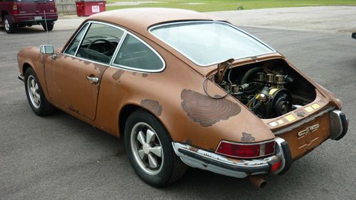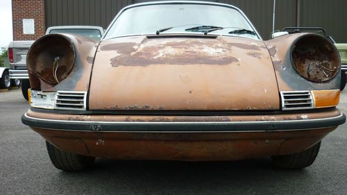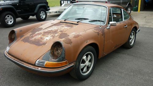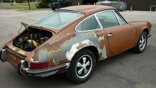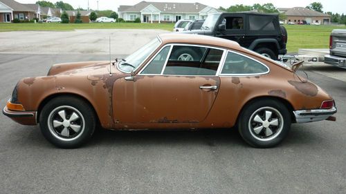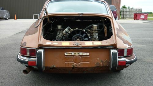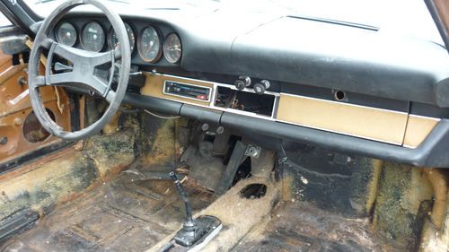Up for grabs is this 1972 Porsche 911T Coupe with 80k original miles AND A CLEAR/CLEAN TITLE! READY FOR RESTORATION!! This one has been sitting for approx. 15 years. Appears to be original color Sepia Brown over cork. The front pan/fuel tank/tank support needs replaced and so does the rear shelf area, but the center of the car including the rockers, main pan, etc are very solid! The engine partially turns after we soaked the cylinders with Marvels Oil. Probably will need a rebuild due to sitting, and this one was fitted with the Weber carbs. Engine and transmission are in the car. The original mechanical injection is not with the car. I have taken pics of all the interior and exterior parts we removed. We stripped out the interior to show accurately what rust issues there are/aren't. Some of the parts didn't survive like the carpet, headliner, part of the door panel, etc., but most all of the rest is there. The front seats that are with it are not period correct. The deck lid is also from a later car as the one that was on it was completely rusted out. The original grill is with it though. Original gauges. Glass is pretty nice. Headlights are there. Chrome trim around glass is good as are the door handles. Looks to be original Fuchs alloys. Has a dent on the roof that can be fixed easily in our opinion. Drivers door needs patched. Pass door is pretty solid. It rolls freely and emergency brake works. Clutch pedal operates. ***Please look at all the pics. What you see is what you get!! If you have questions please email me or call 614-600-8428. Should be a nice restoration for someone, as this has a very good foundation and these rare 72 911's with the oil door on passenger side are getting uncommon. *****AS-IS/WHERE IS/NO WARRANTY EXPRESSED!! THIS IS A NON-RUNNING VEHICLE. BUYER RESPONSIBLE FOR SHIPPING. ALL MONEY MUST BE CLEAR TO PICK IT UP. DO YOUR DILIGENCE PRIOR TO BIDDING. YOUR BID IS BINDING!****