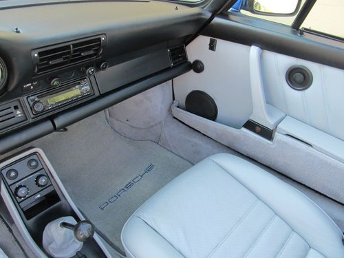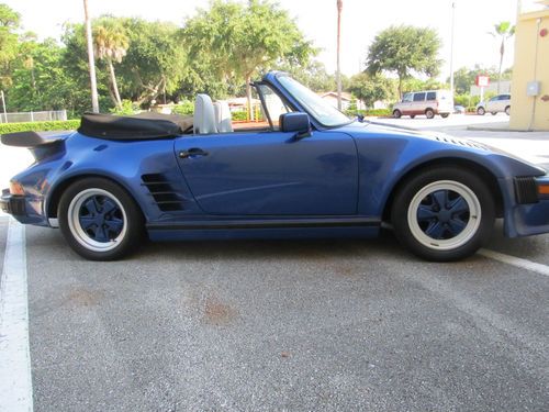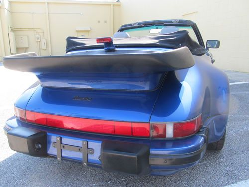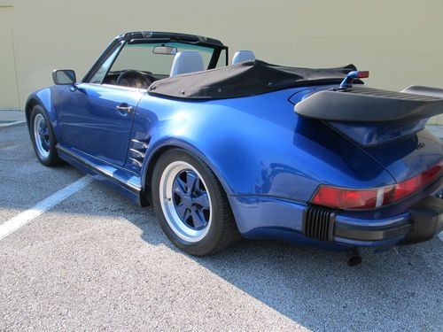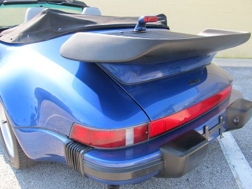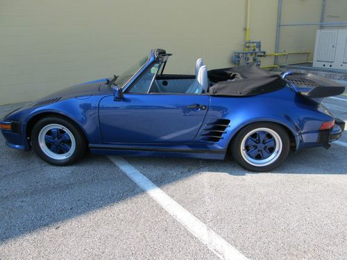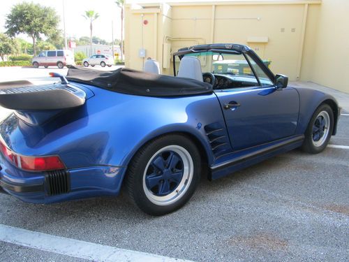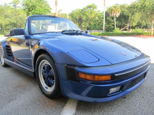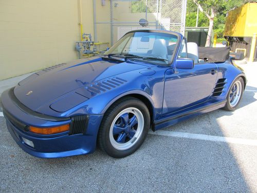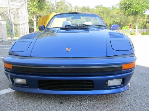 Thanks for looking at our beautiful Porsche. Let me tell you what this car is to the best of my ability. This Porsche started it's life as a 1987 Porsche 911 Cabriolet. It now has a steel factory Slantnose installed very professionally. It has factory rear steel flares. It has a brand new blue top with the factory boot.The top functions perfectly. This car looks as authentic as any Factory Slantnose out there. Real attention paid to the small details. All new door stickers and engine compartment stickers. Near perfect wheels with the correct Turbo offset as you can see in the pictures and right down to Porsche valve stem covers with the logo. Under the front hatch is neat as a pin as you can see in the pictures. It has dual headlight motors. Fit and finish is near perfect. This 911 runs excellent! Super smooth motor and dry as a bone! Smooth brakes and clutch. This car turns every head and has been critiqued by all the local Porsche "Guys" who all agree it is a excellent job. Air cooled 911's are sky rocketing in value and this is a chance to own one of the nicest and most valuable ones. Feel free to call us at 1 386 295 3886 or 295 3301 and we can try to answer all of your questions. Thanks and Good Luck!!