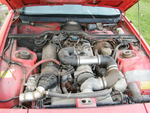 We were told this car ran about a year ago until fuel pump quit. It was bought as a project but plans have changed. We have not had the car running so we can not make any warranty on that fact. 3" Stainless exhaust, aftermarket Intercooler, aftermarket air intake system, we are told the wheels are 928 wheels (not sure), and it is a 5 speed trans. with a 121 CID engine. What we know it needs is fuel pump, battery, windshield (was hit by baseball), and clutch bled. |