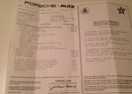 The example you are considering today, is among the cleanest, most original, well kept remaining anywhere. It was purchased new at Williams Porsche/VW by Dr. Gordon Devries, and has been owned by he and his family ever since (until this summer). With the vehicle purchase, comes not only the original window sticker, but also the original, hand written bill of sale (see pics). There is even a dash plaque presented from Porsche to Dr. Devries. The vehicle is even still titled in the original owner's name. Dr. Devries enjoyed his 924 on nice days on the short commute from home to the hospital for nearly 30 years before his retirement. It was only ever driven in friendly weather conditions.