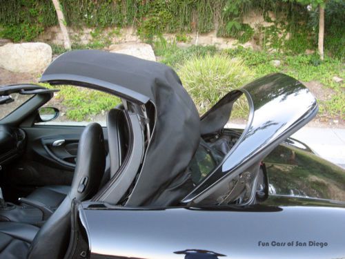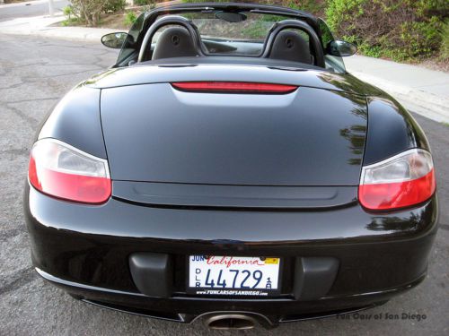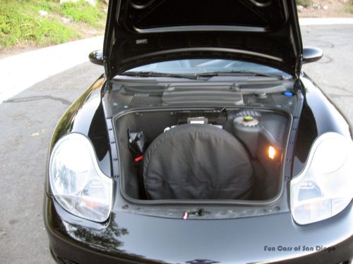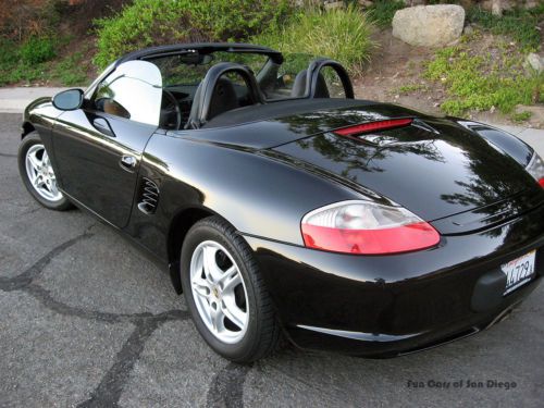 2004 Porsche Boxster  This two-owner, Southern California, Boxster with perfect Carfax is ready for you to chase what remains of summer. This Boxster sports newer tires with about 2,000 miles on them. It is ding and smoke free. And everything works as it should. It includes both of its keys and all of its manuals. This well maintained Boxster does not leak and gets about 24 mpg in mixed driving. The exterior is finished in a smooth and glossy Black Clearcoat complemented with a super clean and fresh Black Leather Interior. The exterior is in great condition all around. The interior is beautiful, especially with the supple leather seats, as equipped. This exquisite Porsche Boxster is in great condition inside and out and looks absolutely great. This roadster has never been smoked in. Convenience factors include power steering, telescopic steering wheel, front cup holders, front reading lights, leather steering wheel, climate control, leather trim on doors and on shift knob, dual illuminating vanity mirrors, rear defogger on the power convertible top rear glass window. This exquisite 2004 Porsche Boxster Roadster is in great condition inside and out. Additional options on this car include the Bose Sound System; painted crested wheels, color keyed roll bars and embossed seats. The engine 2.7 Liter 24-Valve, Dual Overhead Cam (DOHC) Fuel Injected flat-6 engine is phenomenal producing 228 hp @ 6300 rpm, 192 ft-lbs. of torque @ 4750 rpm. It is mated to a smooth shifting 5-Speed Manual Transmission. This vehicle runs and drives absolutely great. This Boxster is in excellent mechanical condition We’ve had a number of Porsches come our way and I can tell you that this is no entry level car. I believe the Boxster to be the best handling Porsche made. The reserve is reasonably set so bid to win. This Boxster recently passed the stringent California smog test so you know it is in superb mechanic condition. This Boxster is listed locally and we reserve the right to end the auction early. Please contact John At 858-212-5396 with any questions.  |