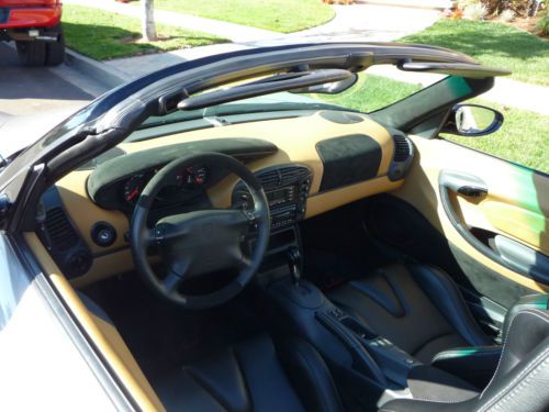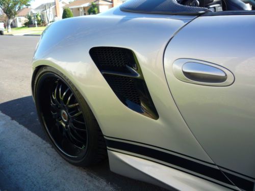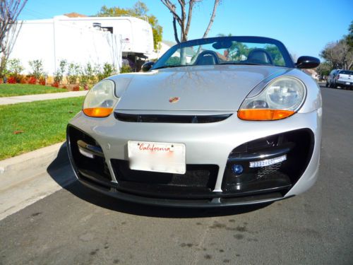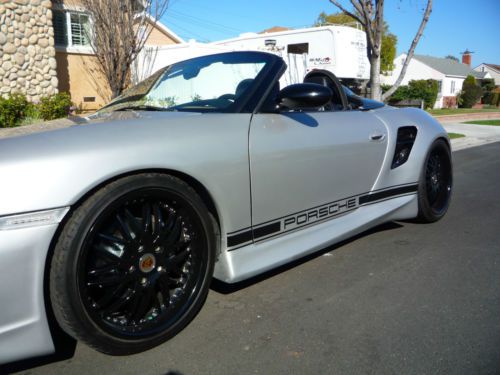 1999 Porsche Boxster with custom GT3 full wide body conversion, with new Artic Silver and black paint scheme. New seats with suede interior accents, new top with upgraded rear heated glass window. New coilover suspension, and black 19" staggerd wheels and tires, new cross drilled rotors and brake pads with new wear sensors on all four wheels. The engine and Tiptronic transmission where both completely rebuilt at 160K mi (with IMS Bearing update completed) The car has custom stainless steal catback exhaust system. All the micro switches have been replaced and both convertible top motors with guides and cables have been replaced. The car also comes with carbon fiber speedster humps.